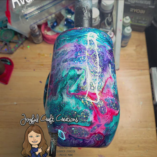 Meet your new favorite statement piece. This 16oz double‑walled stainless steel tumbler features a breathtaking alcohol ink swirl in purple, aqua/teal, pink, and crisp white, finished with a mesmerizing teal prismatic glitter that shifts and sparkles with every turn.