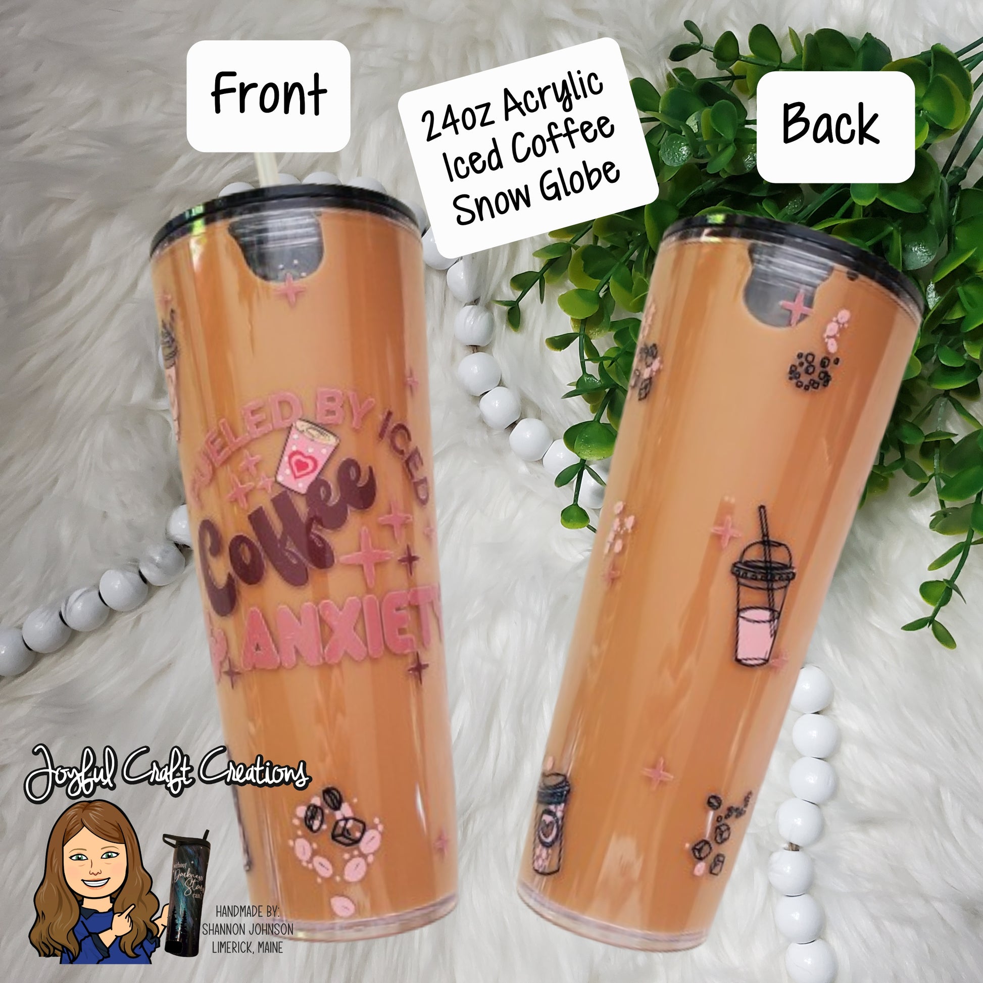 This 24 oz acrylic snow globe features a design perfect for the iced coffee lover. Comes with screw on lid and straw.