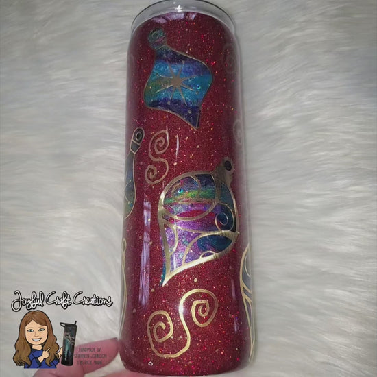 Bring the magic of the season to every sip with this show-stopping 20 oz double-walled stainless steel tumbler. Featuring a peekaboo design with festive ornaments dancing over a rich red glitter base, this handcrafted beauty is a holiday must-have.