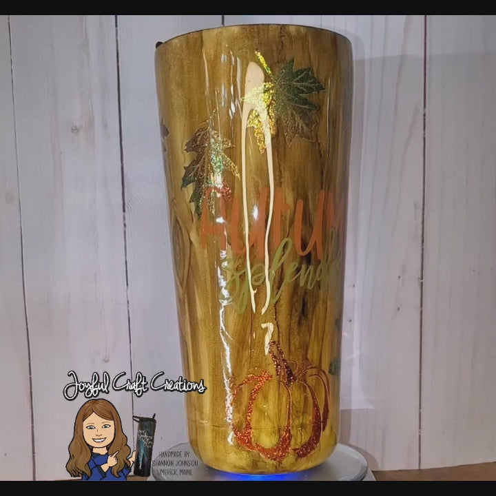 Celebrate the beauty of fall with the Autumn Splendor Tumbler 20 oz. taper style. Featuring a charming peek-a-boo design with woodgrain textures, vibrant foliage, and festive pumpkins, this tumbler brings the cozy spirit of autumn to your daily routine. Perfect for keeping your drinks at the ideal temperature, it’s a unique seasonal accessory—only one available. Don’t miss your chance to own this limited-edition piece that captures the essence of fall wherever you go.