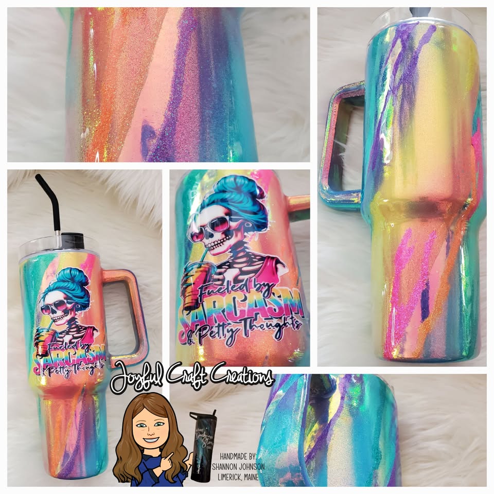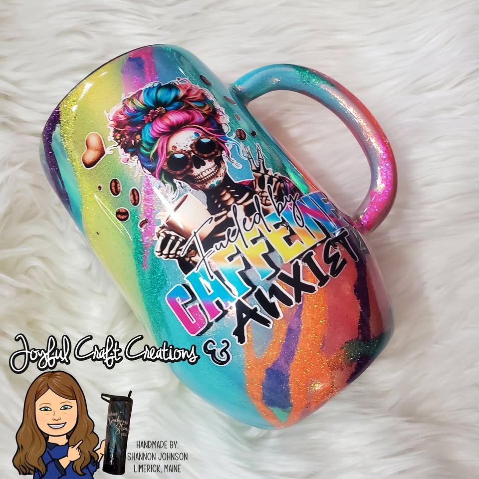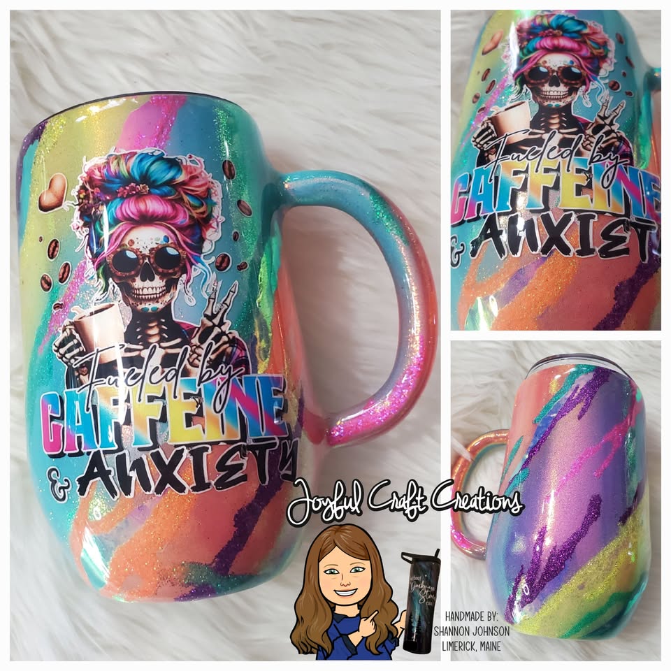 Designed with a color chrome effect with highlights of glitter. You can select if you want a decal (Anxiety or Petty Thoughts)