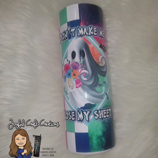 Enjoy your favorite drinks in style with this 20 oz sublimation tumbler featuring a playful ghost and the cheeky quote, "Don't Make Me Lose My Sheet." Designed with vibrant Gen X retro colors, it adds a fun, nostalgic touch to your daily routine. Perfect for Halloween or everyday use, this tumbler keeps beverages hot or cold while expressing your quirky personality. Stay refreshed and showcase your humor wherever you go.
