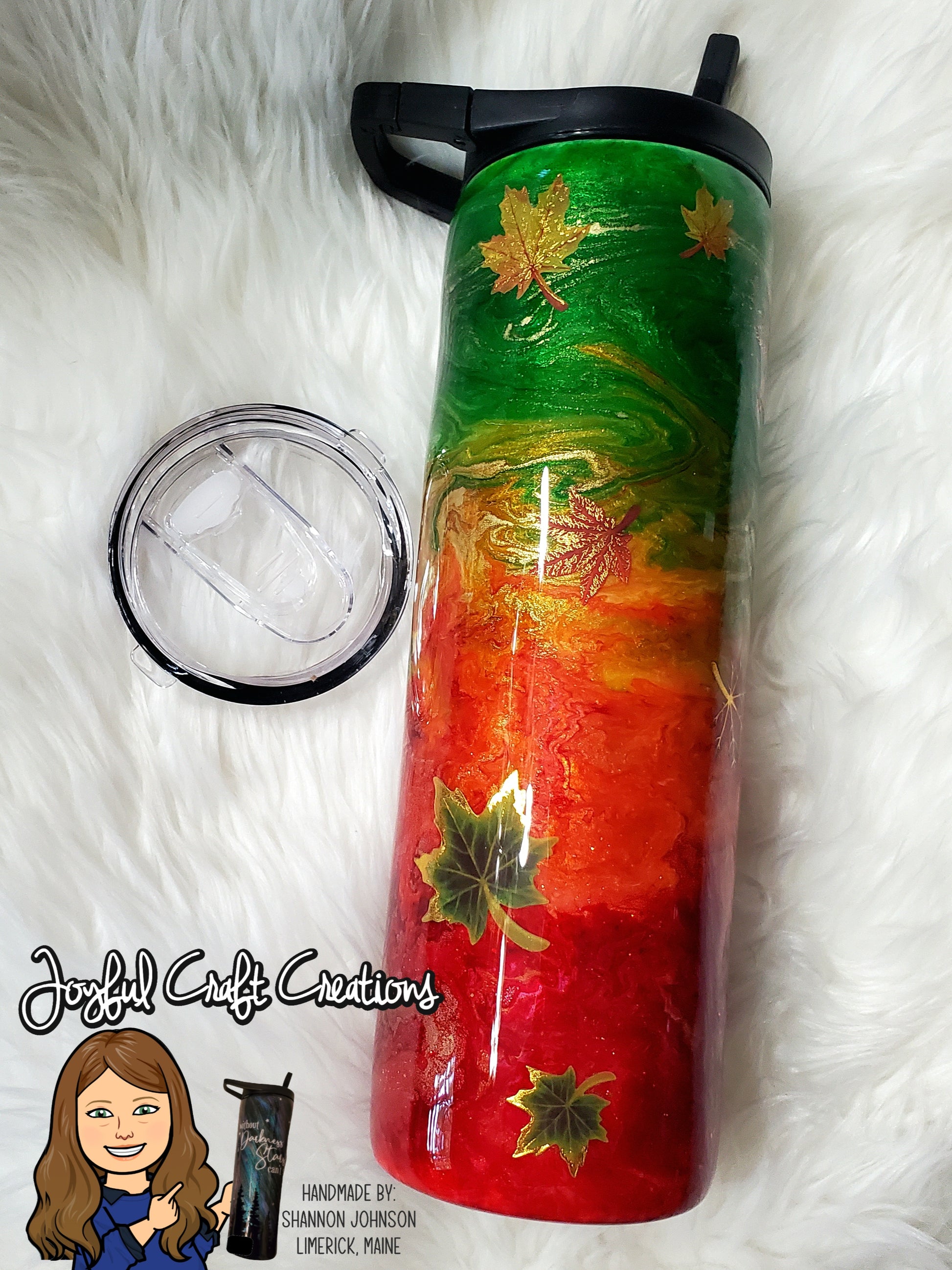 Experience the vibrant essence of autumn with the Fall Leaves tumbler. Showcasing a stunning ink swirl in vivid green, gold, orange, and red, accented by delicate fall leaves gently cascading over the surface. This eye-catching design brings the season’s rich colors to life, making every sip feel connected to the beauty of fall. Perfect for cozy mornings or crisp afternoons, this tumbler combines artistry and function to elevate your seasonal beverage moments.