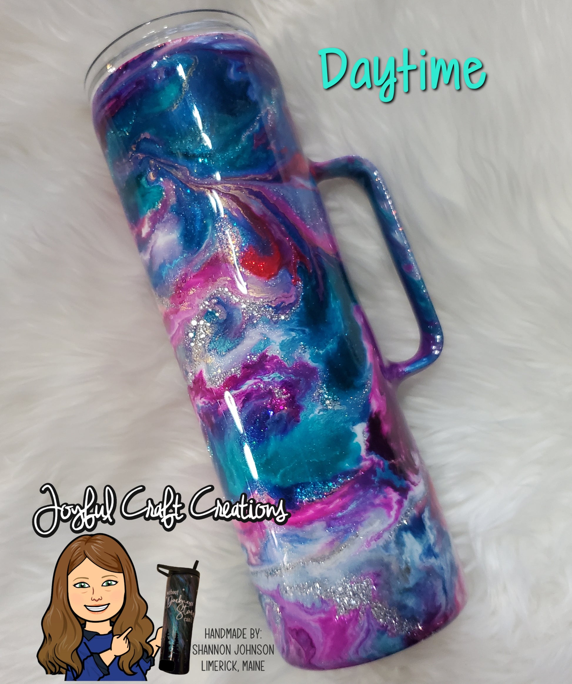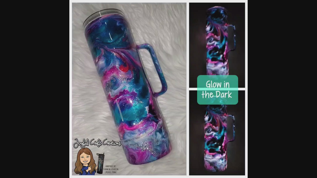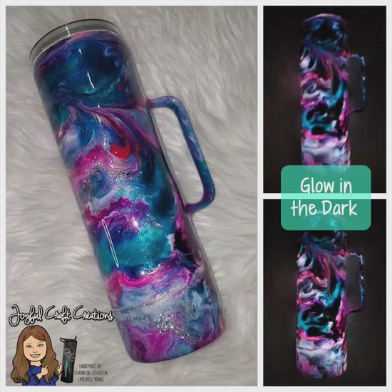 Experience the magic of this 30 oz Handled Tumbler featuring a stunning Glow in the Dark Alcohol Ink Swirl. Vibrant teal, pink, purple, and silver glitter create a mesmerizing design that charges with natural sunlight or UV light, glowing beautifully in the dark. Perfect for adding a touch of sparkle to your day or night, this unique tumbler is a one-of-a-kind treasure—only one available. Stay refreshed in style while enjoying a captivating glow wherever you go.