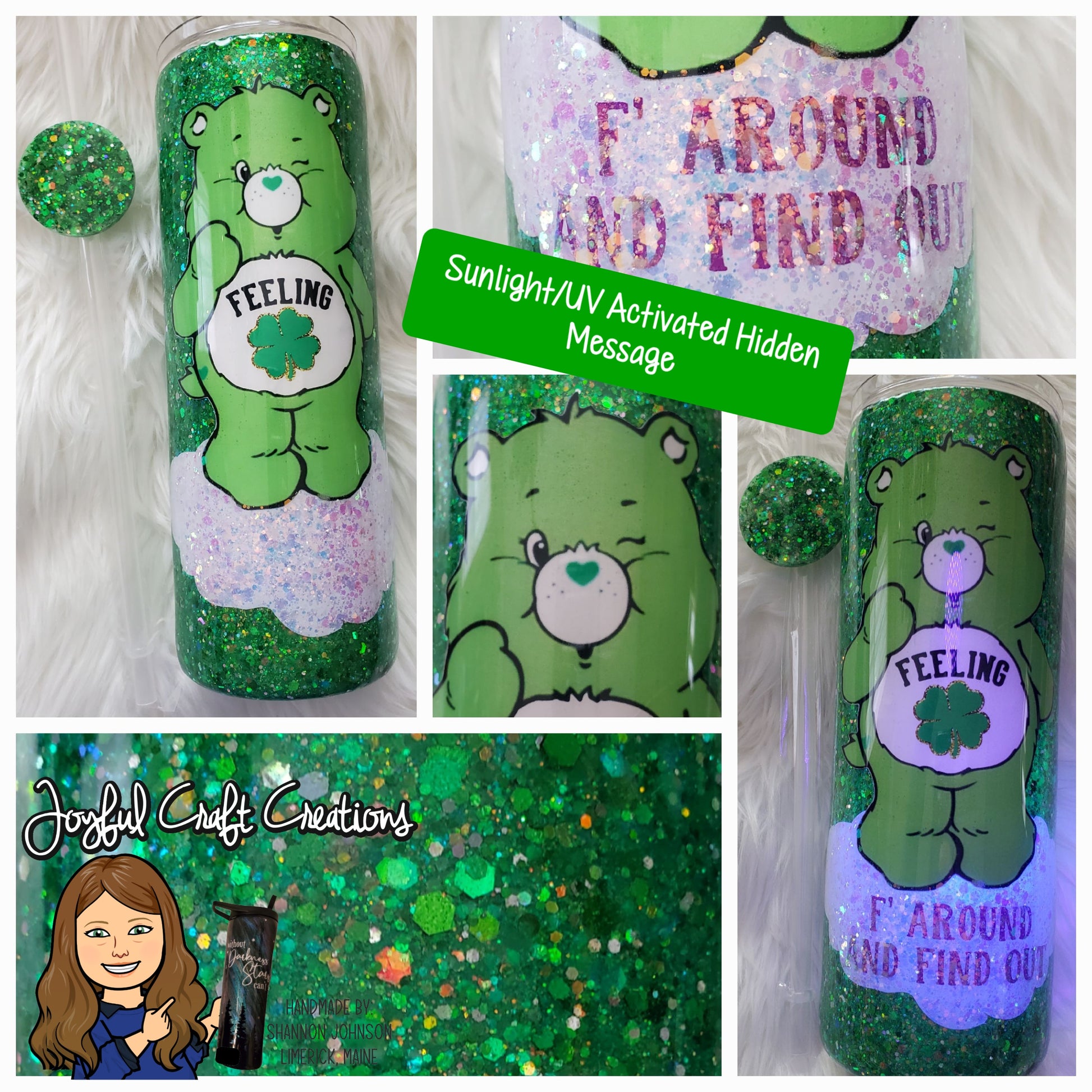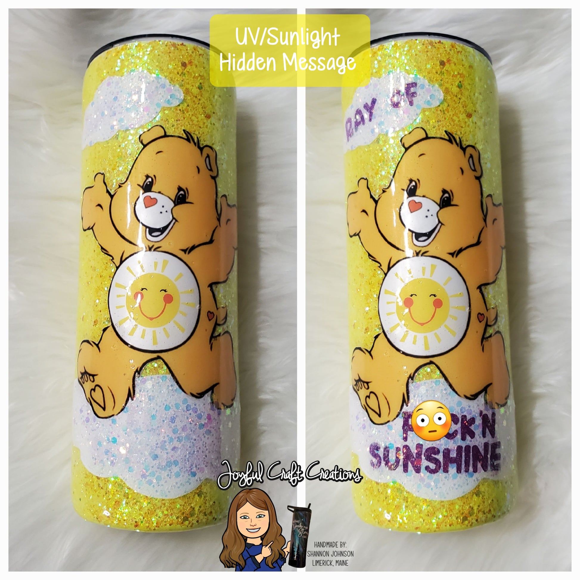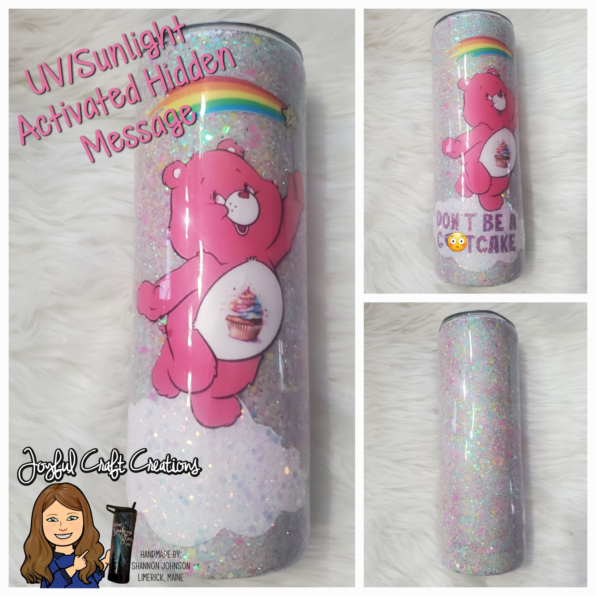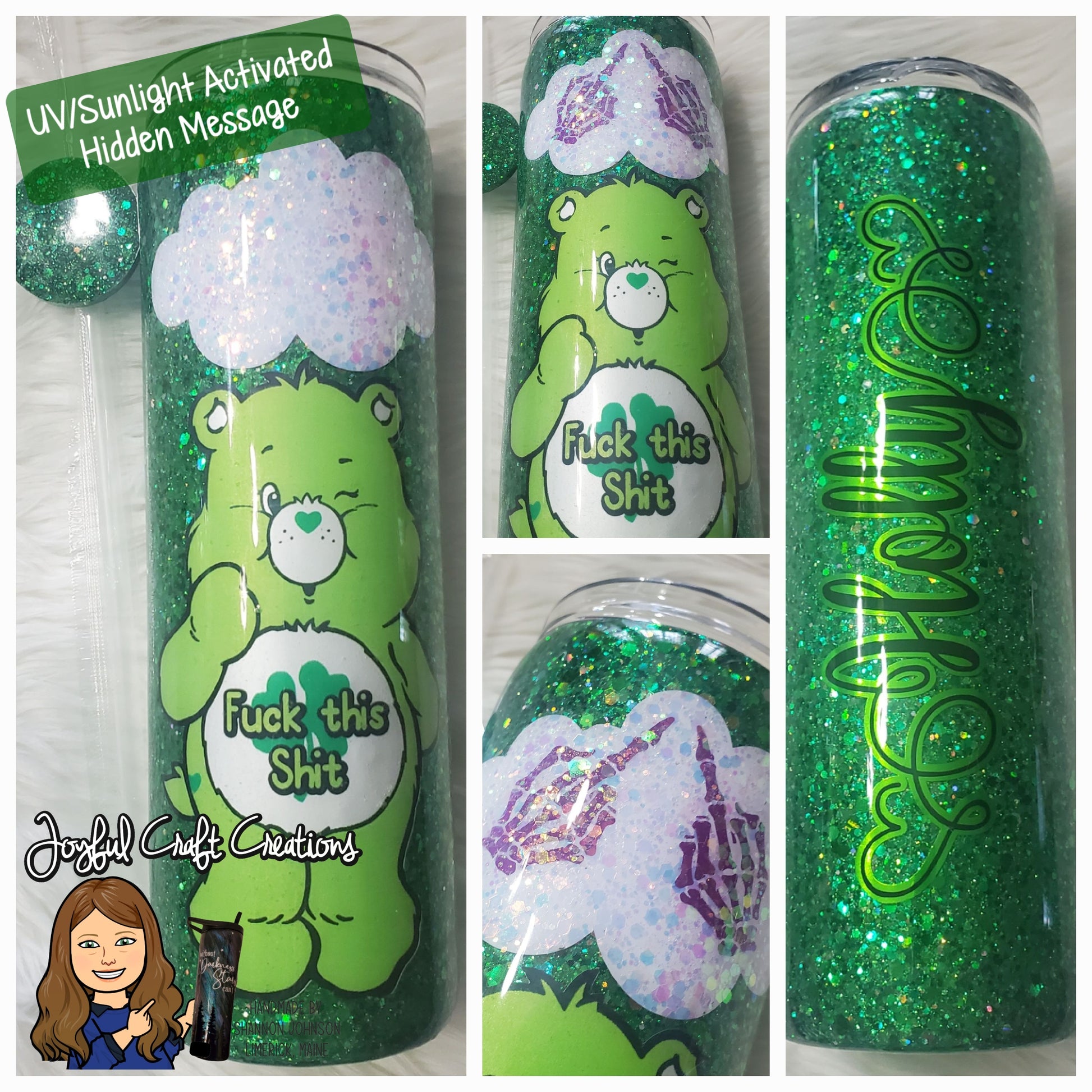 Each tumbler is hand made on a stainless-steel double walled tumbler base. These cute bears bring back nostalgia of your childhood while providing a little adult humor for today. Their "hidden" message is only activated and shown when exposed to either UV or Sunlight and will fade back to hidden when out of UV/sunlight. (Photos are of prior orders)