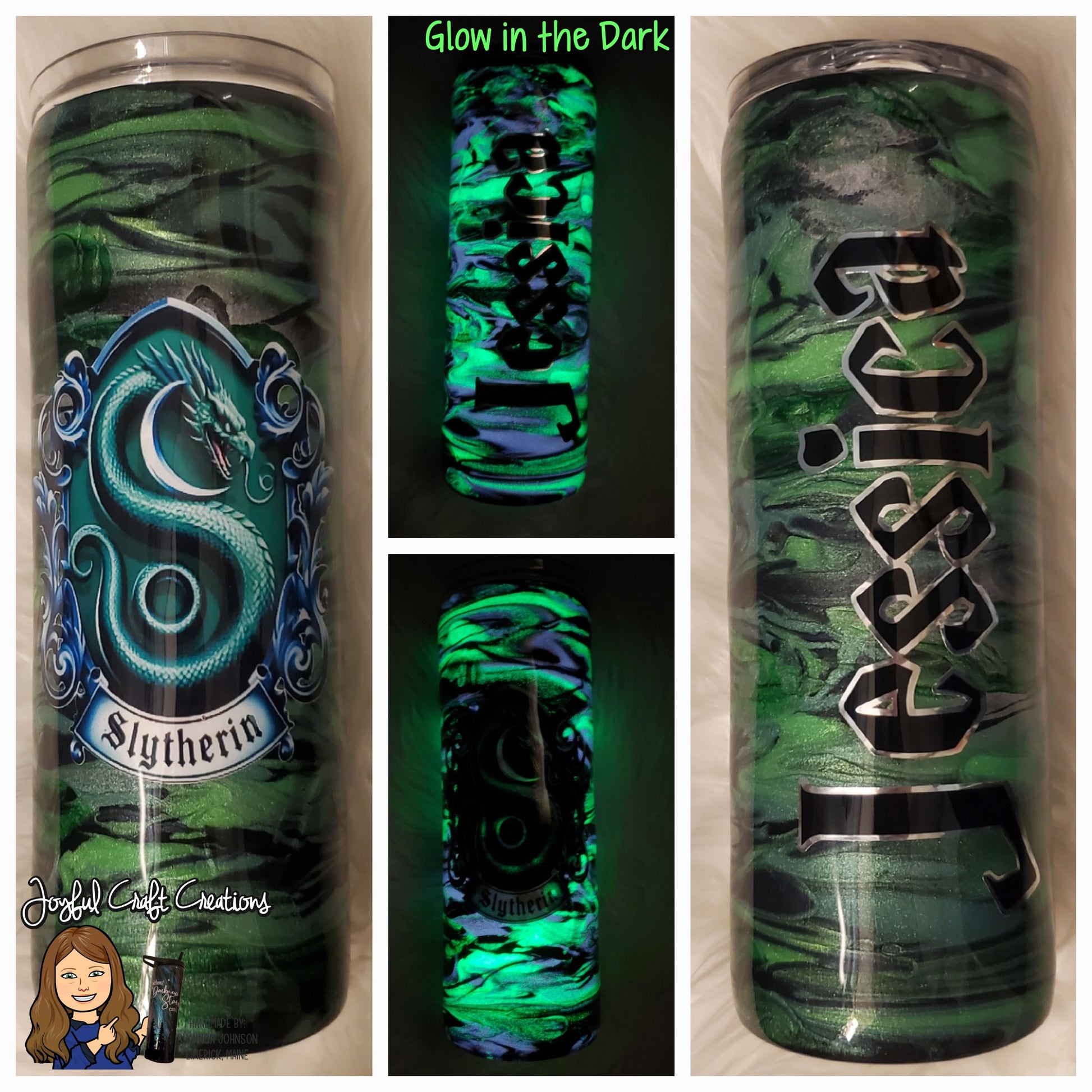 Show your Hogwarts pride with the Harry Potter inspired (HP) Glow in the Dark House Crest Tumbler, featuring your favorite house colors—Slytherin, Hufflepuff, Gryffindor, or Ravenclaw. Each tumbler glows in the dark with coordinating shades, making it perfect for both day and night use. Personalize it by adding a name on the back for a truly unique touch. Stay refreshed while showcasing your wizarding allegiance in style.