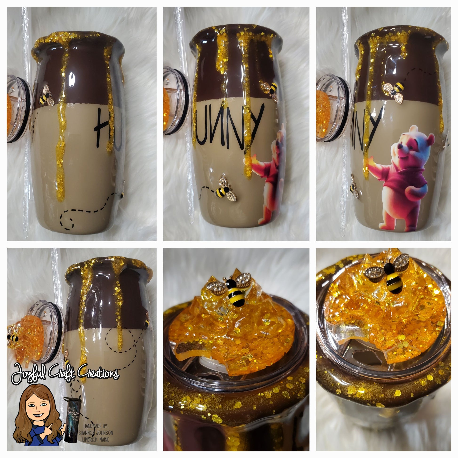 Each tumbler is hand made on a stainless-steel double walled tumbler base. This particular design boasts bejeweled bumble bees buzzing around the glittery dripping "honey" from the rim of the "Hunny Pot" (Photos are of prior orders)
