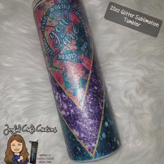 The Inspiration Tumbler is a 20 oz double walled stainless steel tumbler that sparkles with vivid colors and an inspiring reminder to uplift your day. Keep your drinks hot or cold while being reminded of your strength, capability, love, worth, importance, and kindness.