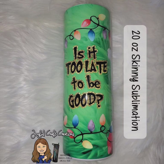Show off your holiday humor with this 20 oz sublimation tumbler featuring the Grinch and the cheeky phrase, "Is it too late to be good?" Perfect for Gen-Xers who love a playful twist on Christmas traditions, this tumbler keeps your drinks hot or cold while adding a mischievous spirit to your festive season.