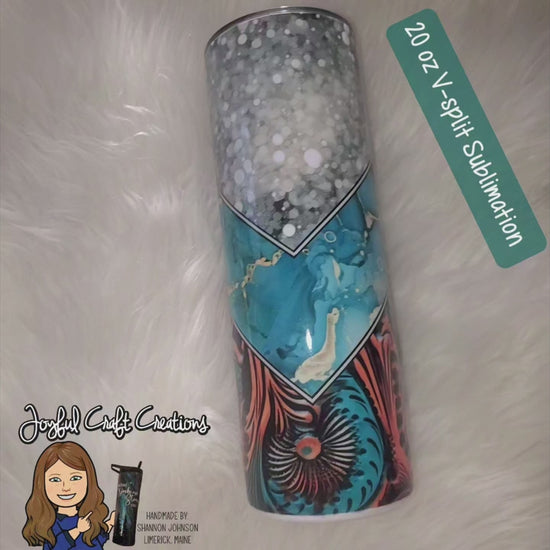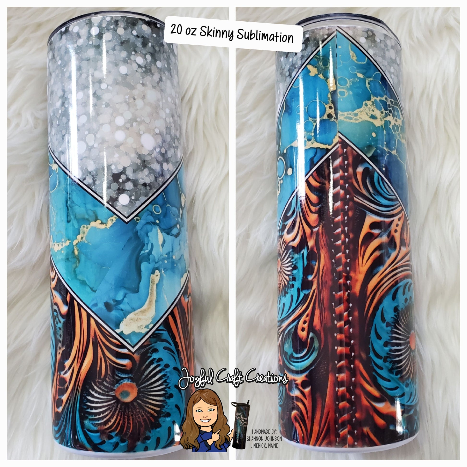 This 20 oz sublimation tumbler gives off cowboy/western vibes. Created to look like tooled leather with turquoise and digital glitter v-split design.