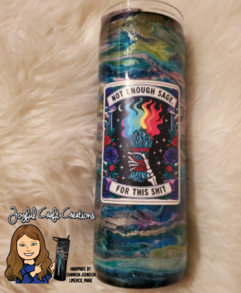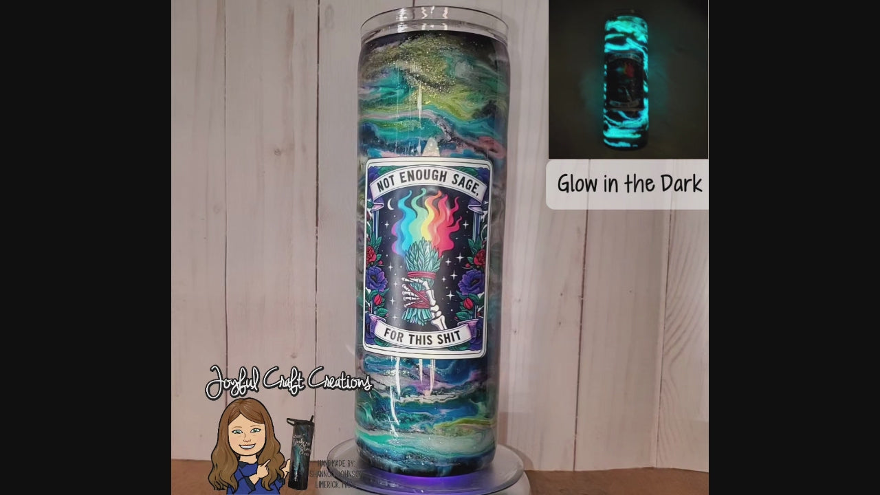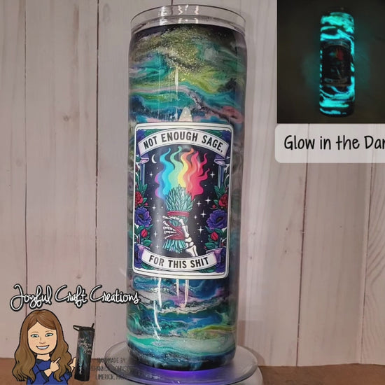 Make a bold statement with the 20 oz Not Enough Sage Tumbler, featuring a dazzling glow-in-the-dark alcohol ink swirl that charges under sunlight or UV light. This sparkly tumbler showcases the cheeky phrase "Not Enough Sage For This Shit," combining humor with eye-catching design. Perfect for keeping your drinks at the right temperature while adding a touch of personality, it’s an essential accessory for those who want to stand out both day and night.