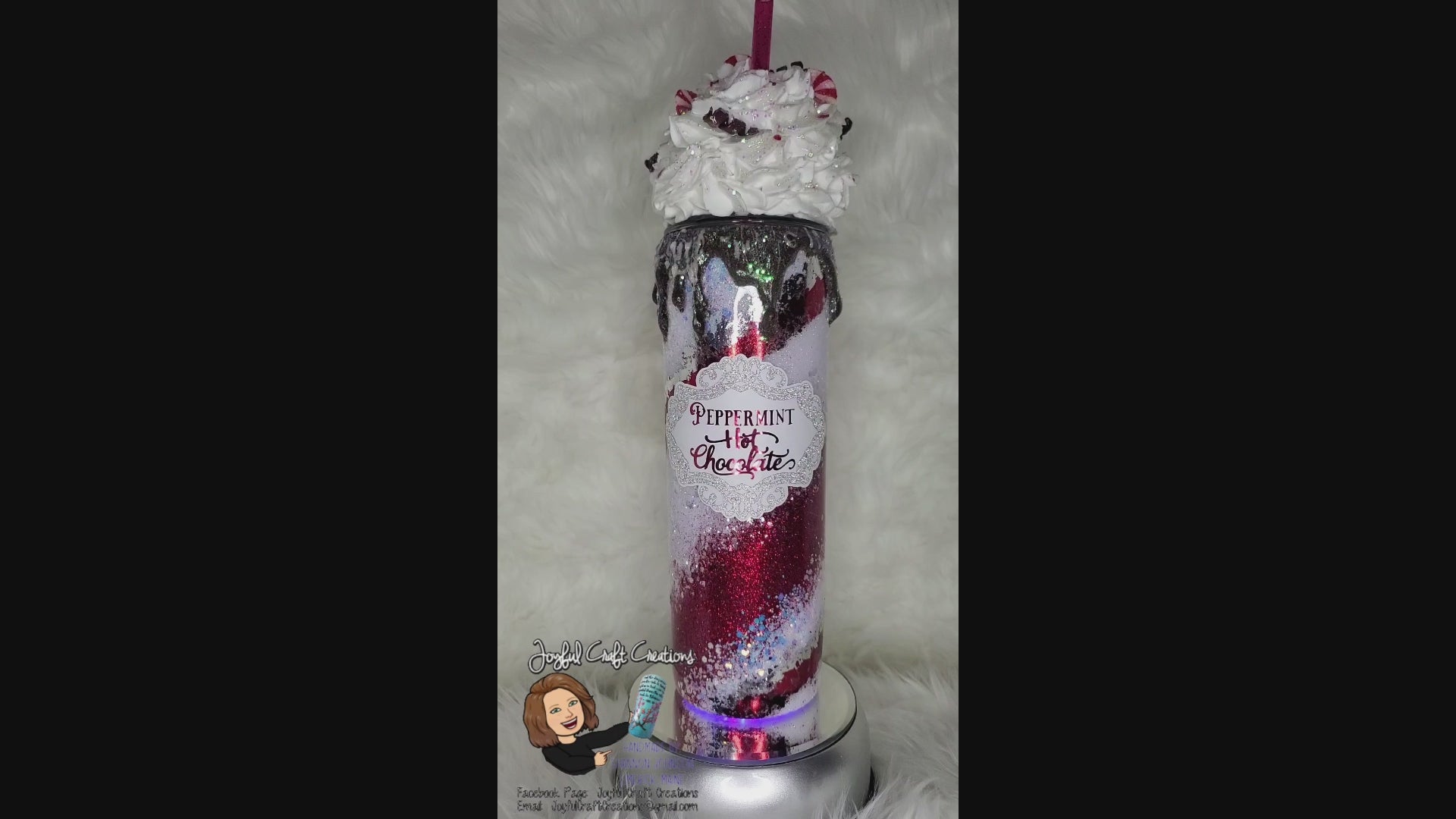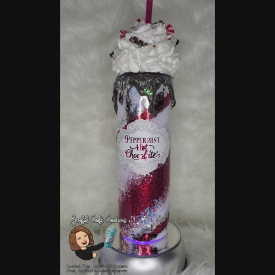 Created on a 20 oz skinny tumbler and designed to look like a peppermint stick with hot chocolate overflowing, this tumbler is pure holiday magic. The coordinating faux whip cream magnetic lid topper is decked out with faux peppermints, chocolate shavings, and a dusting of glitter—because your cocoa deserves sparkle.