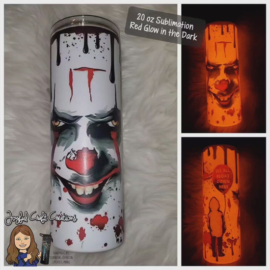 Experience spine-chilling style with this 20 oz sublimation tumbler that glows red in the dark. Featuring the iconic Pennywise from IT holding his signature red balloon and the haunting phrase "We all Float Down Here," this design is intensified by striking blood splatters and drips. Perfect for horror fans who want a unique, eerie accessory that stands out day or night. Durable and eye-catching, it’s the ultimate conversation starter for those who dare to embrace the dark side.
