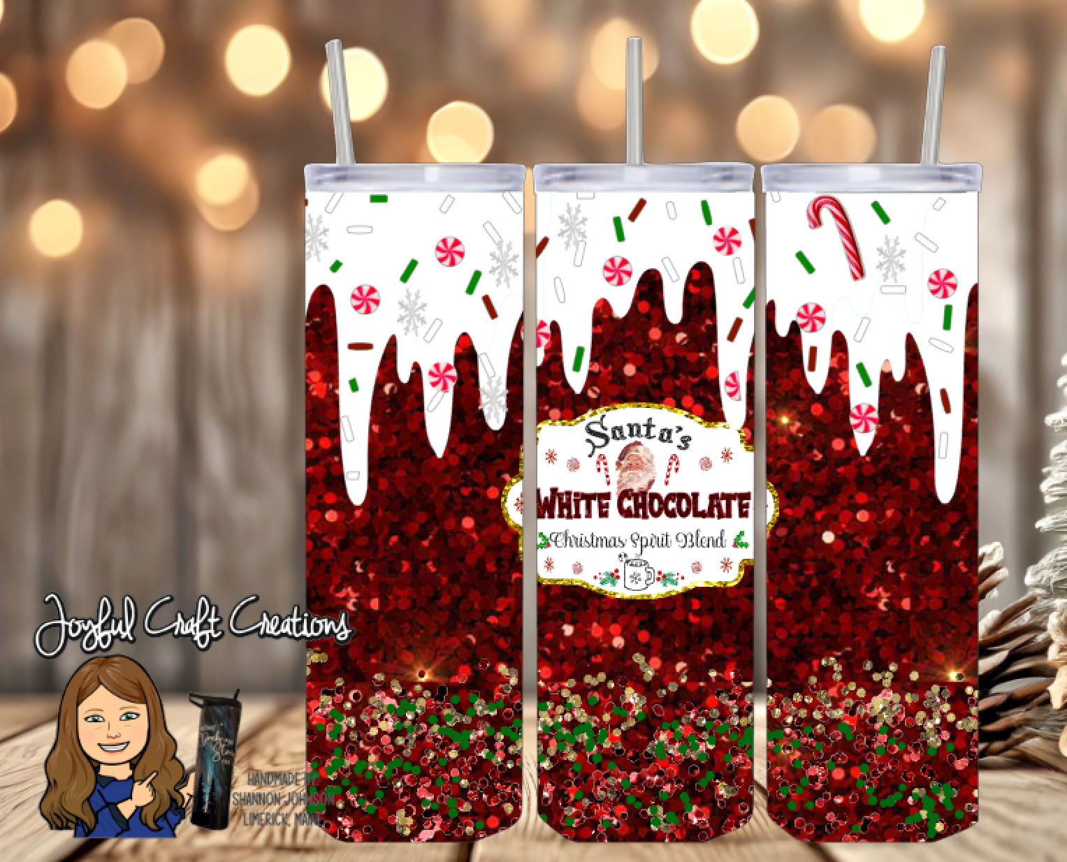 - Design: Digital image dripping with fake white chocolate with peppermints and sprinkles—because Santa’s blend deserves a festive crown.