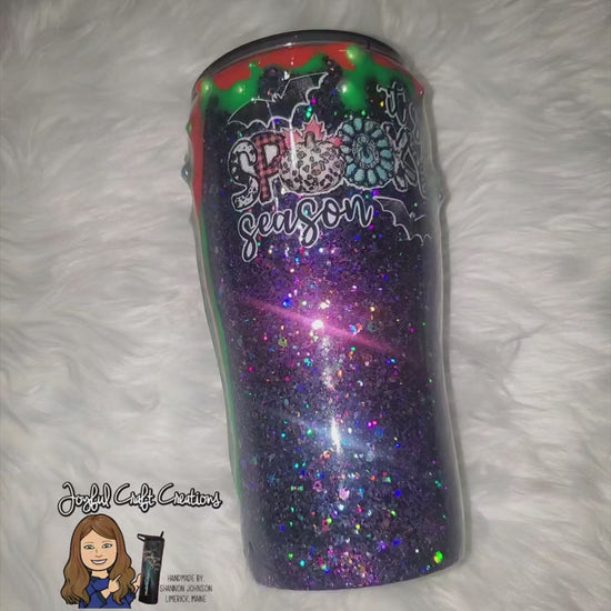 Celebrate Halloween in style with the Spooky Season 20 oz Tumbler. Featuring vibrant orange and green bubbly potion drips accented by beautiful purples, orange, and magenta glitter, this tumbler captures the festive spirit perfectly. Its eye-catching design makes it an ideal companion for your seasonal drinks, keeping you refreshed while adding a touch of spooky charm.