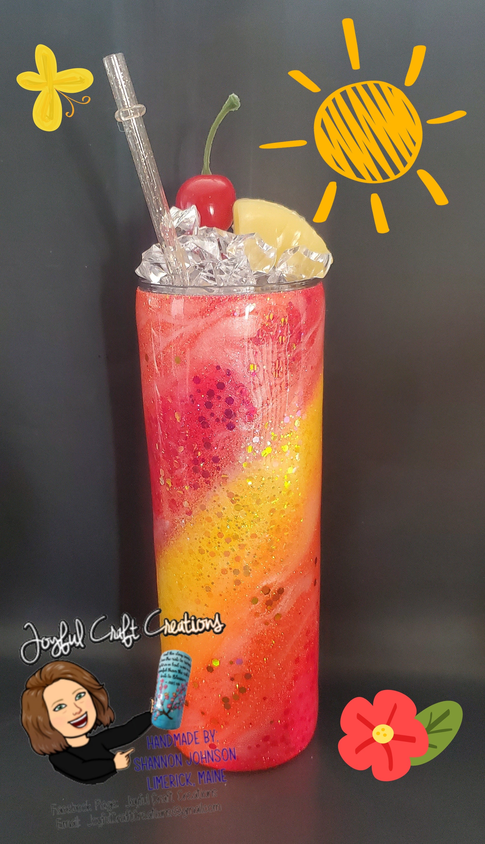 Each tumbler is hand made on a stainless-steel double walled tumbler base. Perfect tumbler for the summer heat! Comes with magnetic coordinating lid topper of tropic embellishments with fake ice. (Photos are of prior orders)